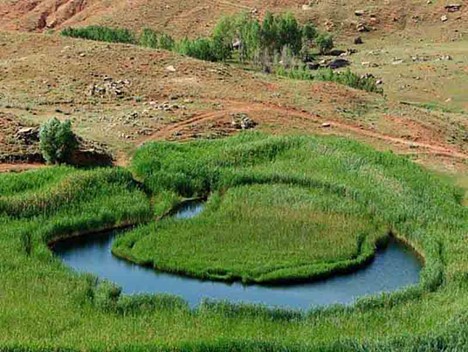 در مرکز مجموعه، یک دریاچهی طبیعی با آبی زلال و فیروزهای وجود دارد. می گویند این دریاچه در تمام طول سال دمایی ثابت دارد و هیچوقت یخ نمیزند. آبش سرشار از املاح معدنی است، و هرچیزی در آن بیفتد، به مرور سنگوارهای آهکی میشود. همین ویژگی دلیل باور به “جادویی بودن آب” بوده است.